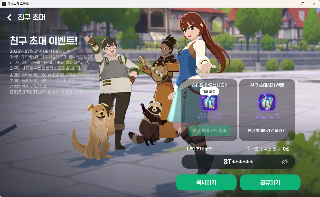 친구 초대 코드 입력시 프리미엄 패션 티켓 10개를 줍니다.